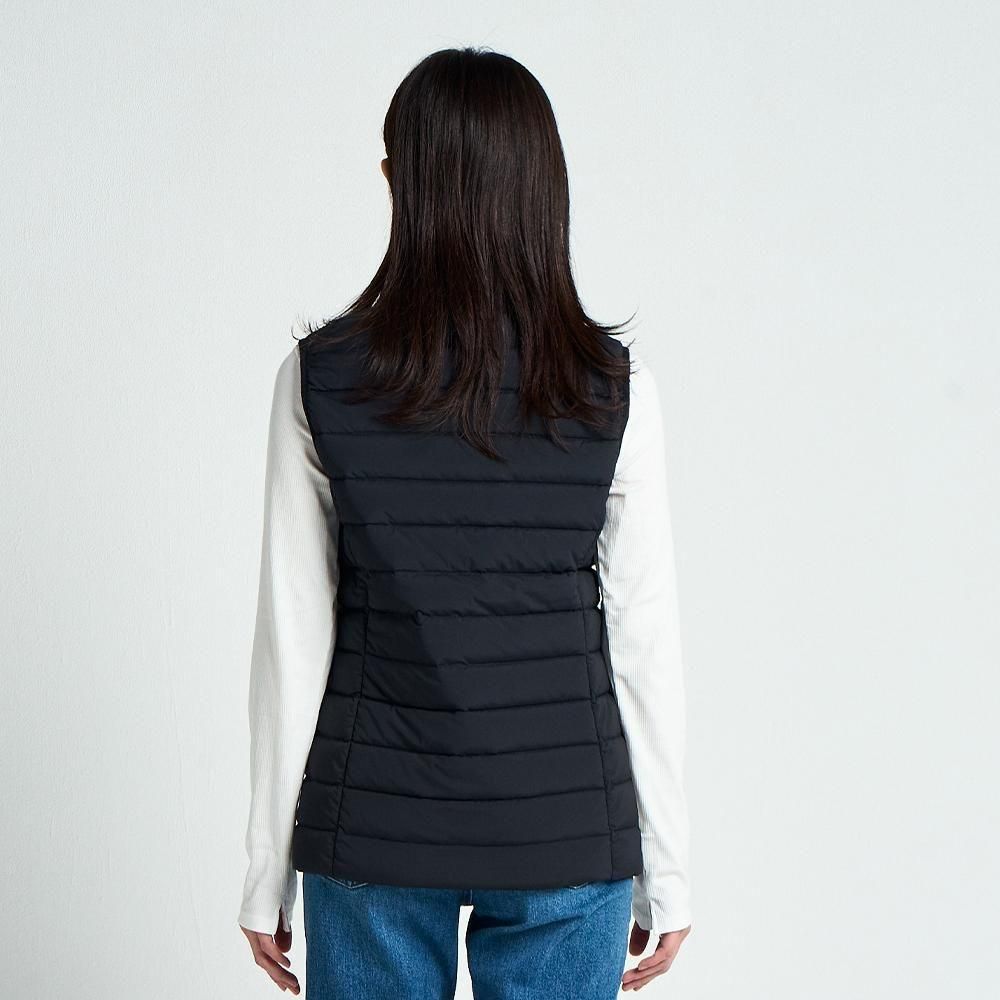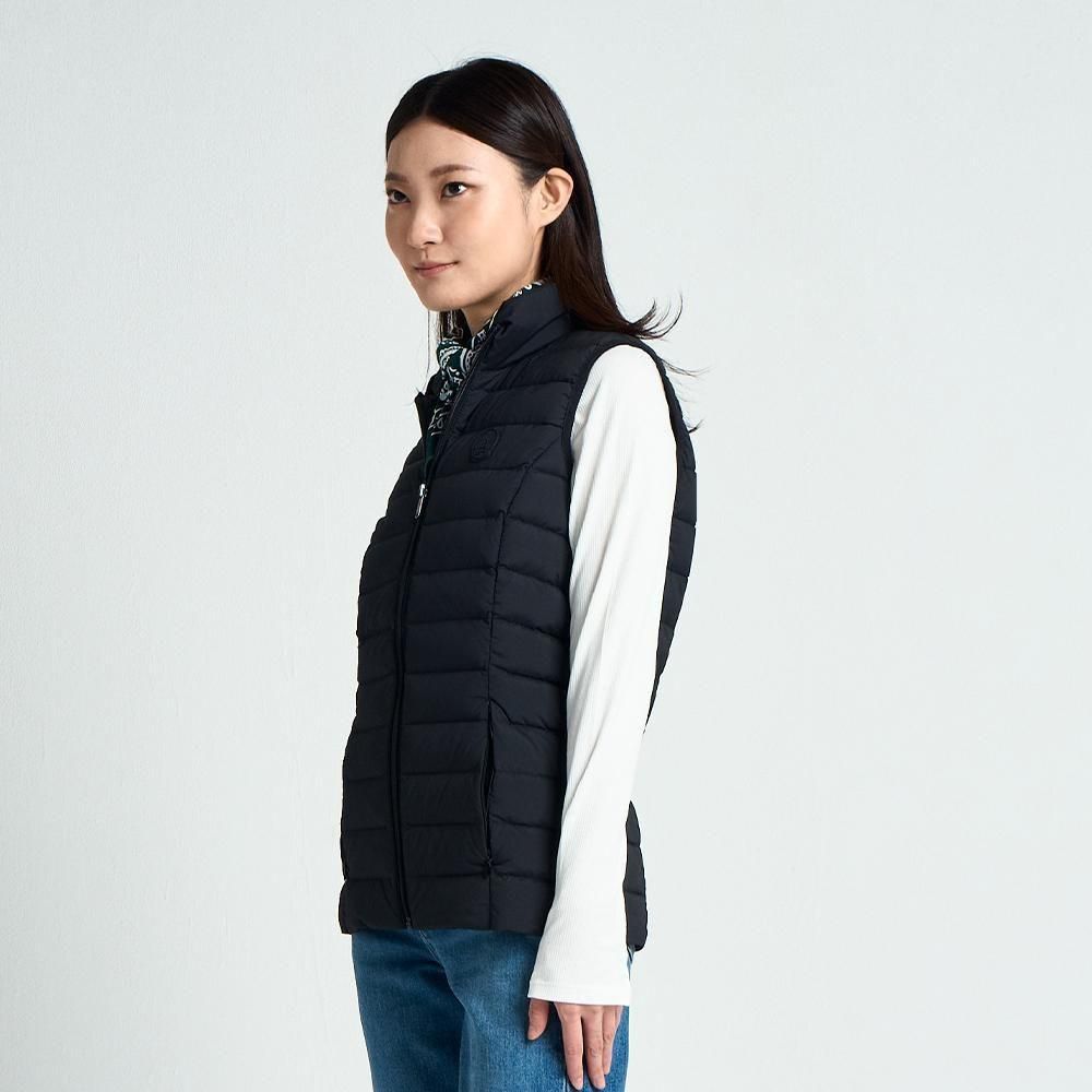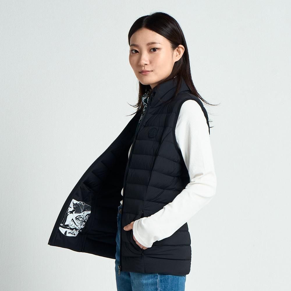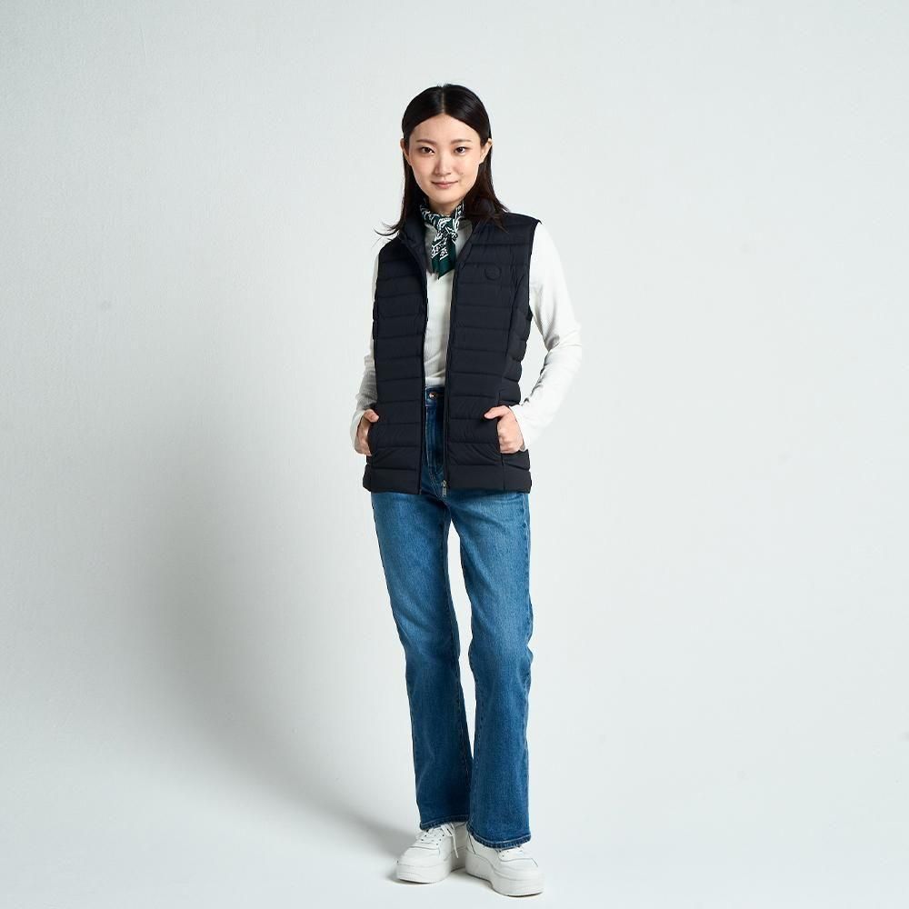 フードなしのダウンベスト「GRENADA」は、普段使いしやすい腰までの着丈です。